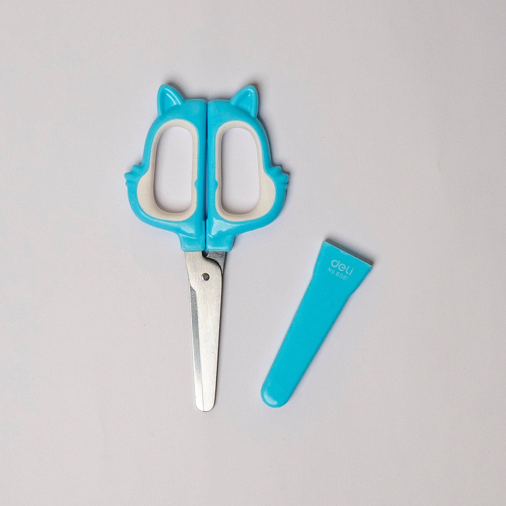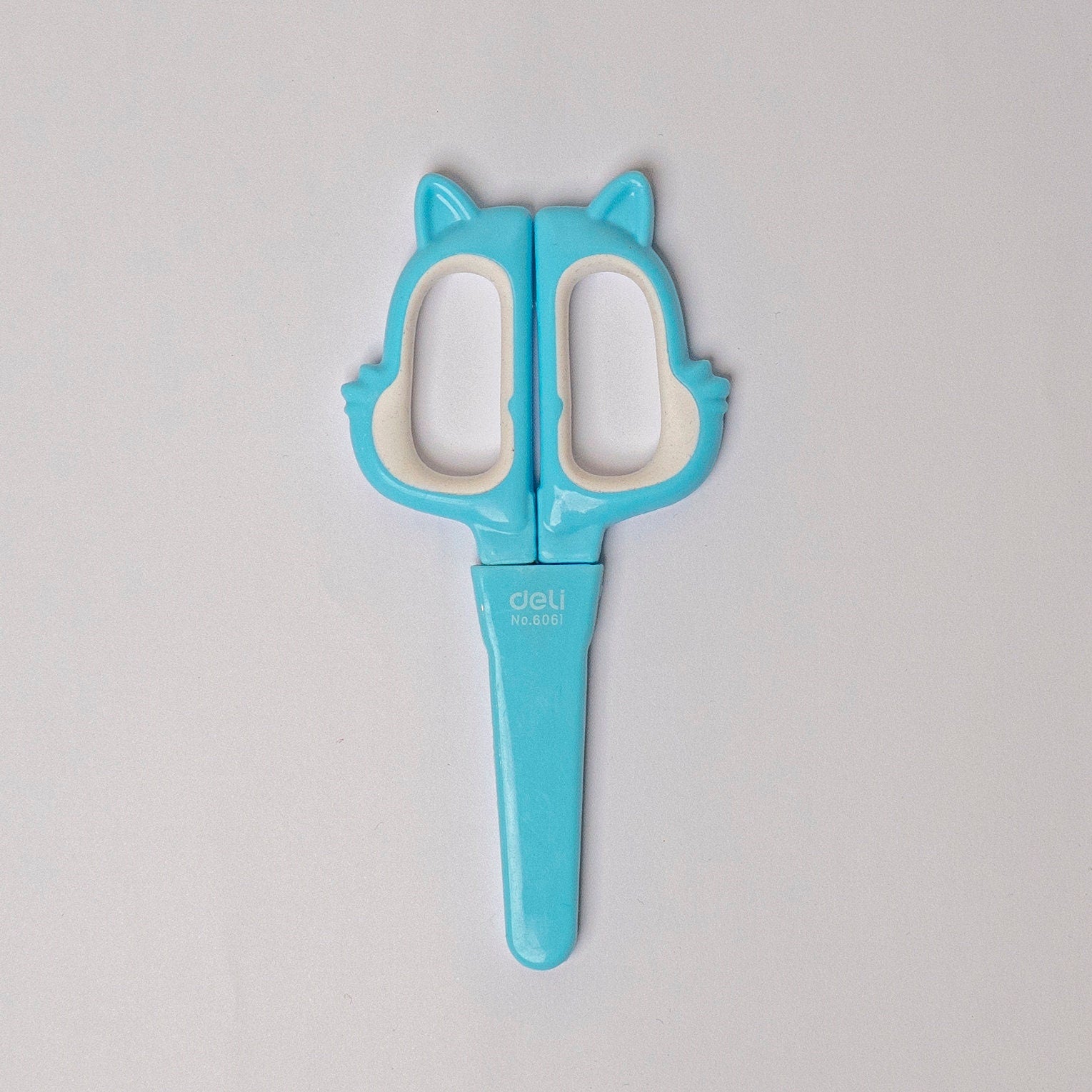 Blue cat-shaped scissors! Designed for both functionality and cuteness, these compact, foldable scissors feature cat ear handles and come with a protective cover for safety. Perfect for crafting, school, office, and home use, they’re a fun and practical choice for all ages.