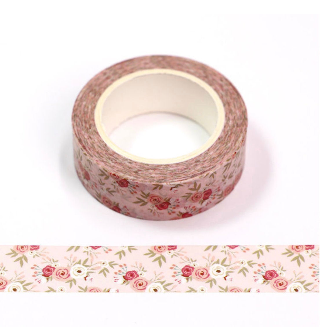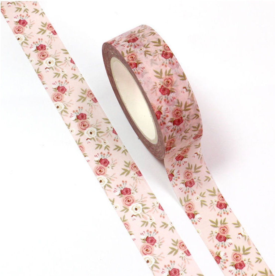 Beautiful floral washi tape! Featuring a delicate rose pattern in soft pink, red, and green accents, this decorative tape is perfect for scrapbooking, journaling, gift wrapping, and DIY crafts. Its vintage-inspired design brings a romantic and sophisticated charm to any creative work.