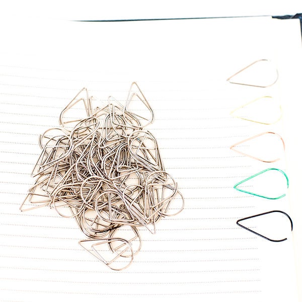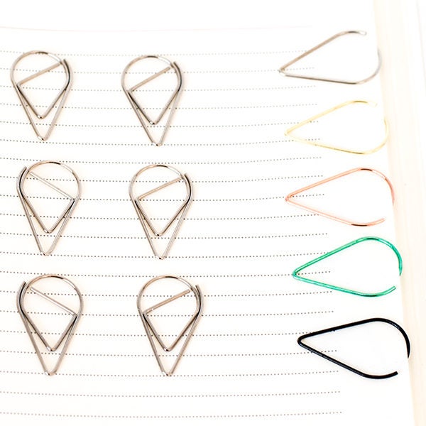 Set of 10 teardrop shaped paperclips. These clips are the perfect way to secure papers, they also make ideal page markers so you won’t lose your place. With their beautiful geometric shape these clips are sure to grab attention wherever you choose to put them!